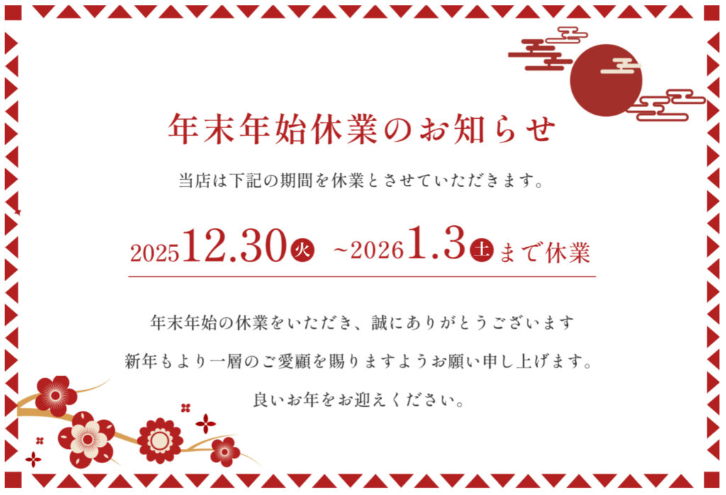 年末年始休診日のお知らせ 2025年12月17日 【年末年始休診日のお知らせ】 12月30日(火)~1月3日(土)までお休みさせていただきます。 1月4日(日)より通常通りの受付となります。 ご迷惑をおかけしますが、よろしくお願いいたします。
